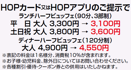 3種類いずれかのHOPカード又はHOPアプリのご提示で優待が受けられます。