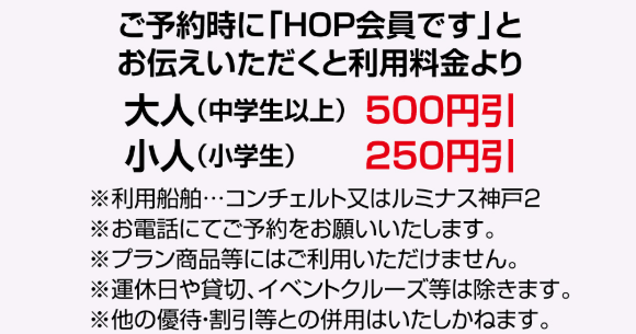 3種類いずれかのHOPカード又はHOPアプリのご提示で優待が受けられます。