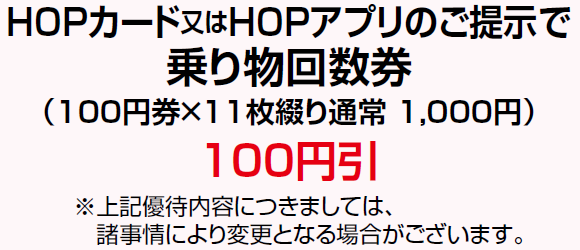 3種類いずれかのHOPカード又はHOPアプリのご提示で優待が受けられます。